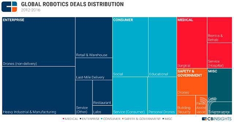 从下面的分布图能够看出,48%的投资给了面向企业的机械人,这里面包罗了沉工业和制制业正在内的各大行业。面向消费者的机械人投资正在过去5年中占比28%,面向医疗的占比13%。还有很小的一部门6.5%,流向了安保范畴。