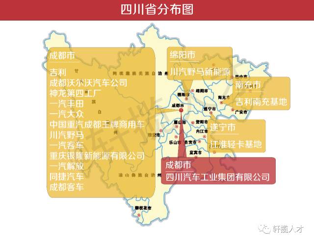从这张分布图中能够看出,四川的车企出产制制核心次要集中正在成都这一块,谈到成都的主要性,一汽公共汽车无限公司总司理安铁成已经说过:“成都是一汽公共继之后的第二个出产,它的建成对于一汽公共来说,其意义不只仅是产能的添加,更具有正在中国西部区域的计谋性感化。”
